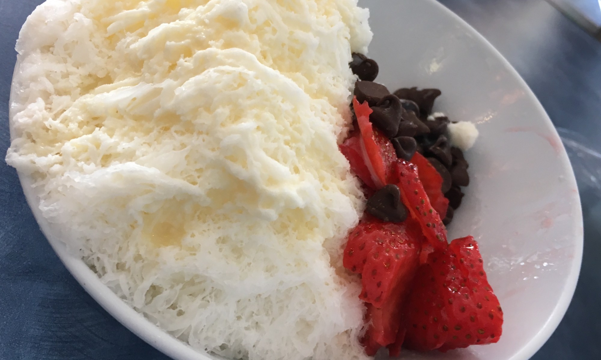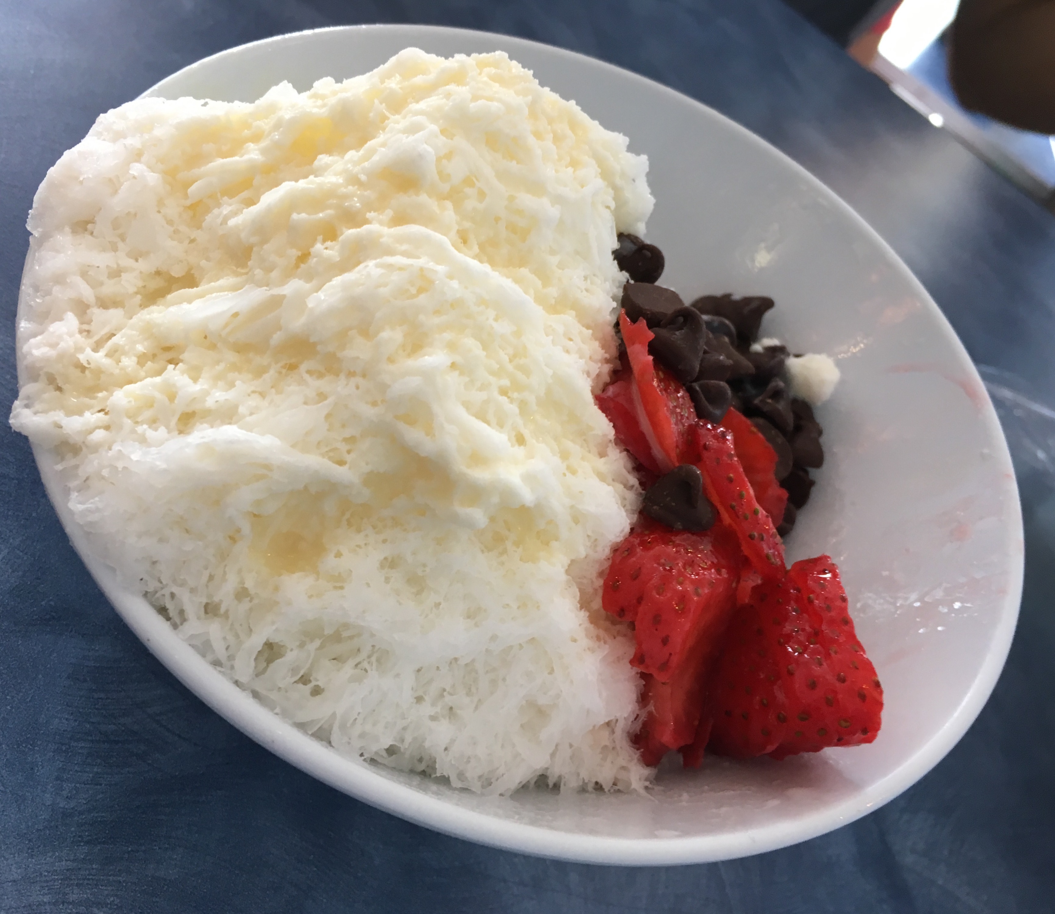 Vanilla snow ice topped with condensed milk and with a side of chocolate chips and strawberries (a few bites taken of course).