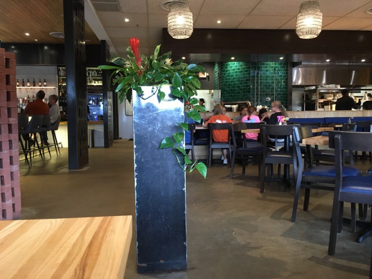 The restaurant is modern and strategically open. What I mean by strategic is the divisions are smartly place to separate the bar from the main dining area and from the private dining room. The bar is separated by a diagonal brick accent wall, adding a hint of rustic vibes to the modern setting. To get to the private dining area, you need to pass the open kitchen and main dining area to get to the back corner hallway. I didn’t realize that existed until a large group of homecoming girls came in followed the waitress to the hall. There’s also an outdoor seating area complete with a matching brick accent wall patio and fenced in playground.