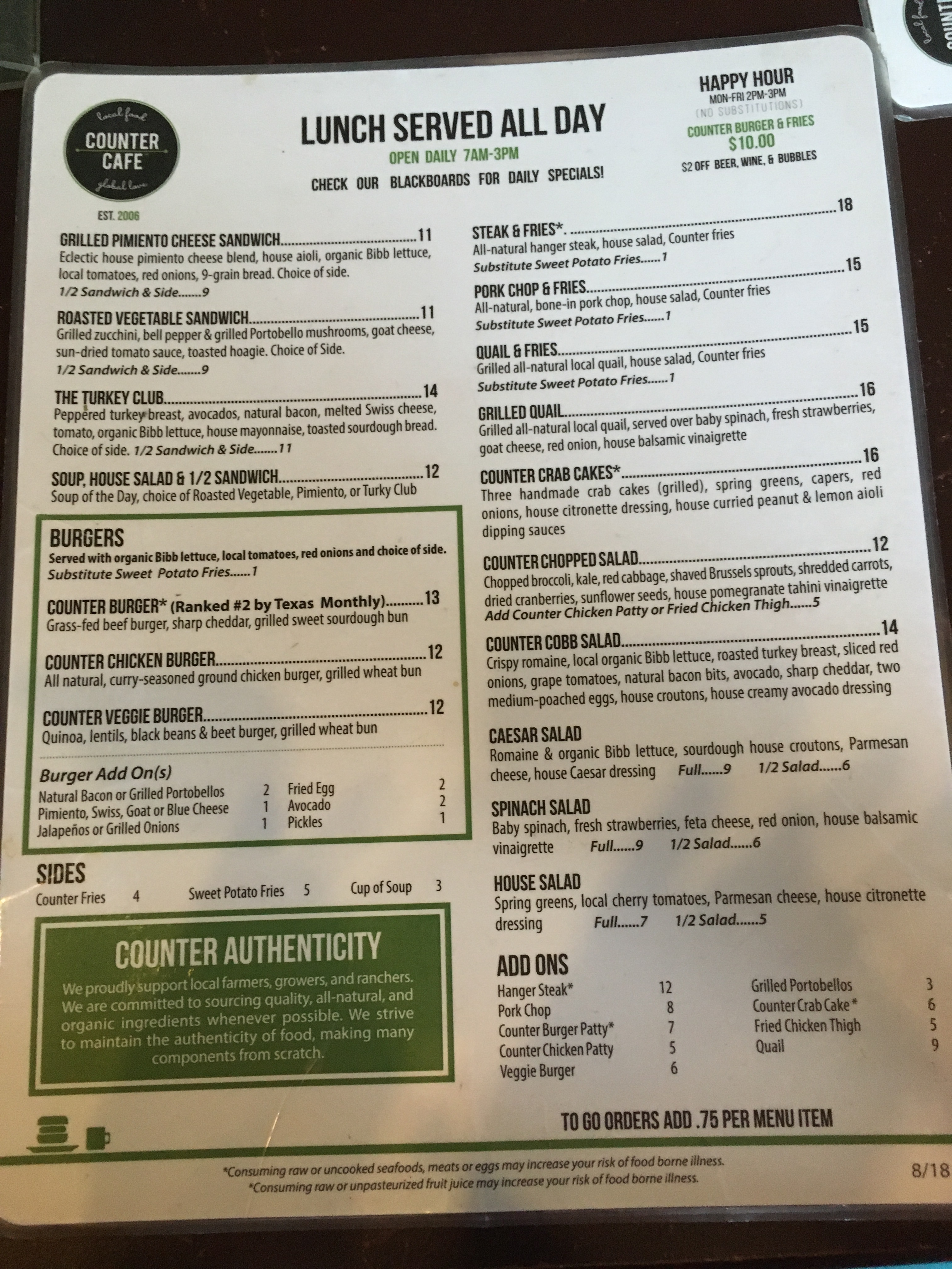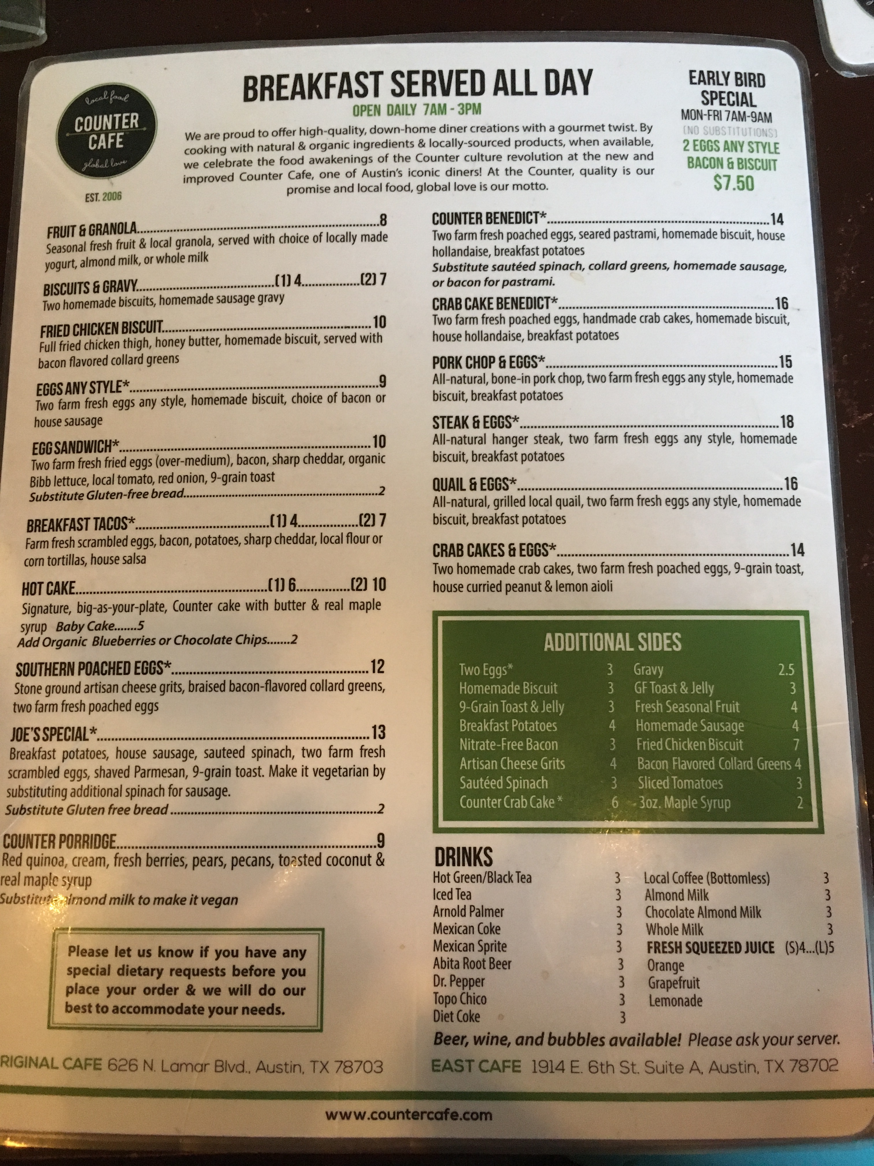 If you don’t mind sitting in a tight spot for a nice casual breakfast, I recommend Counter Cafe. You can even make a day trip around it: Counter Cafe, trip to BookPeople, Whole Foods Market on Lamar & 5th, or even to Graffiti Park a couple blocks up. Obviously, when the weather is better than this mid-50s slump.