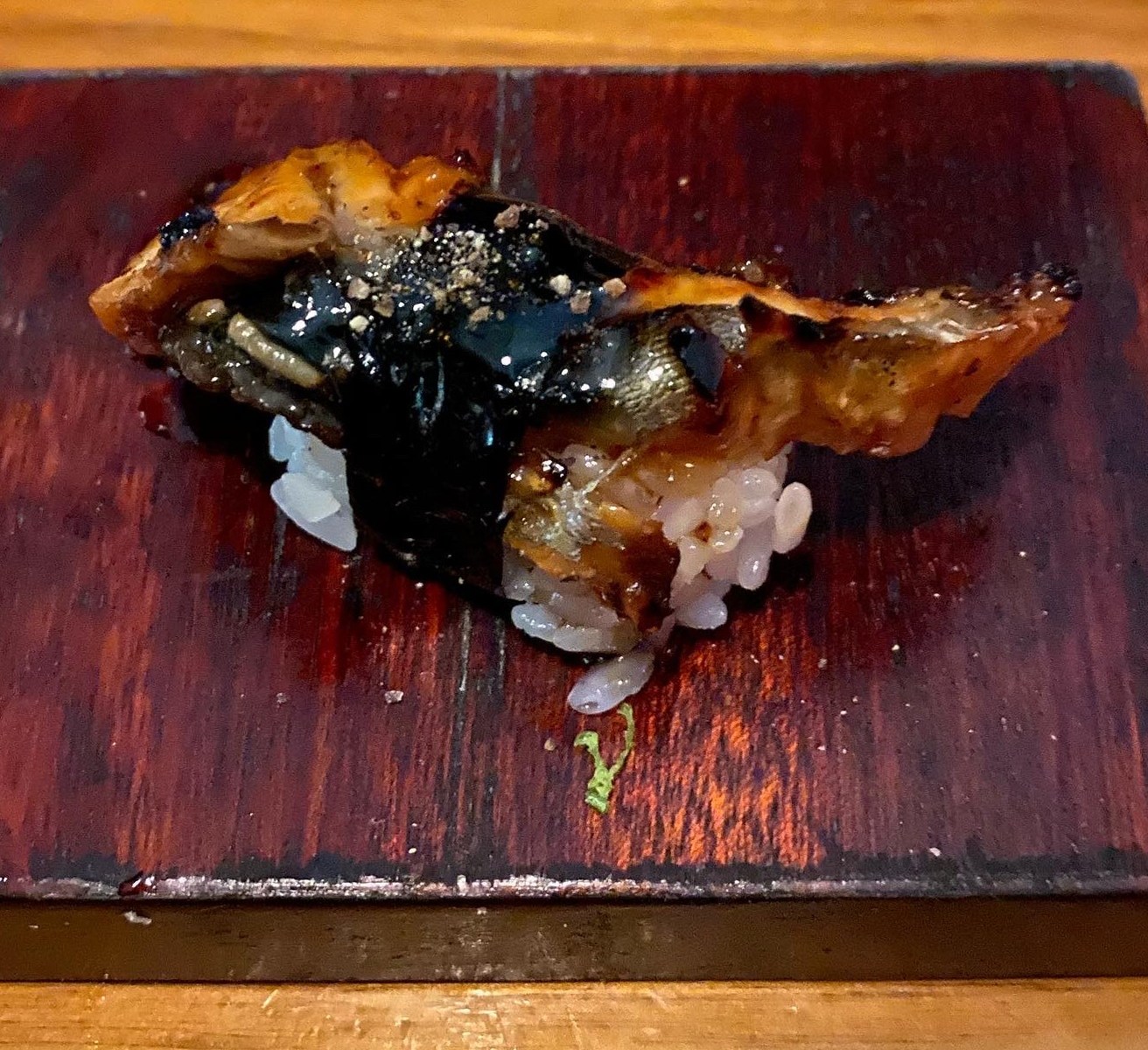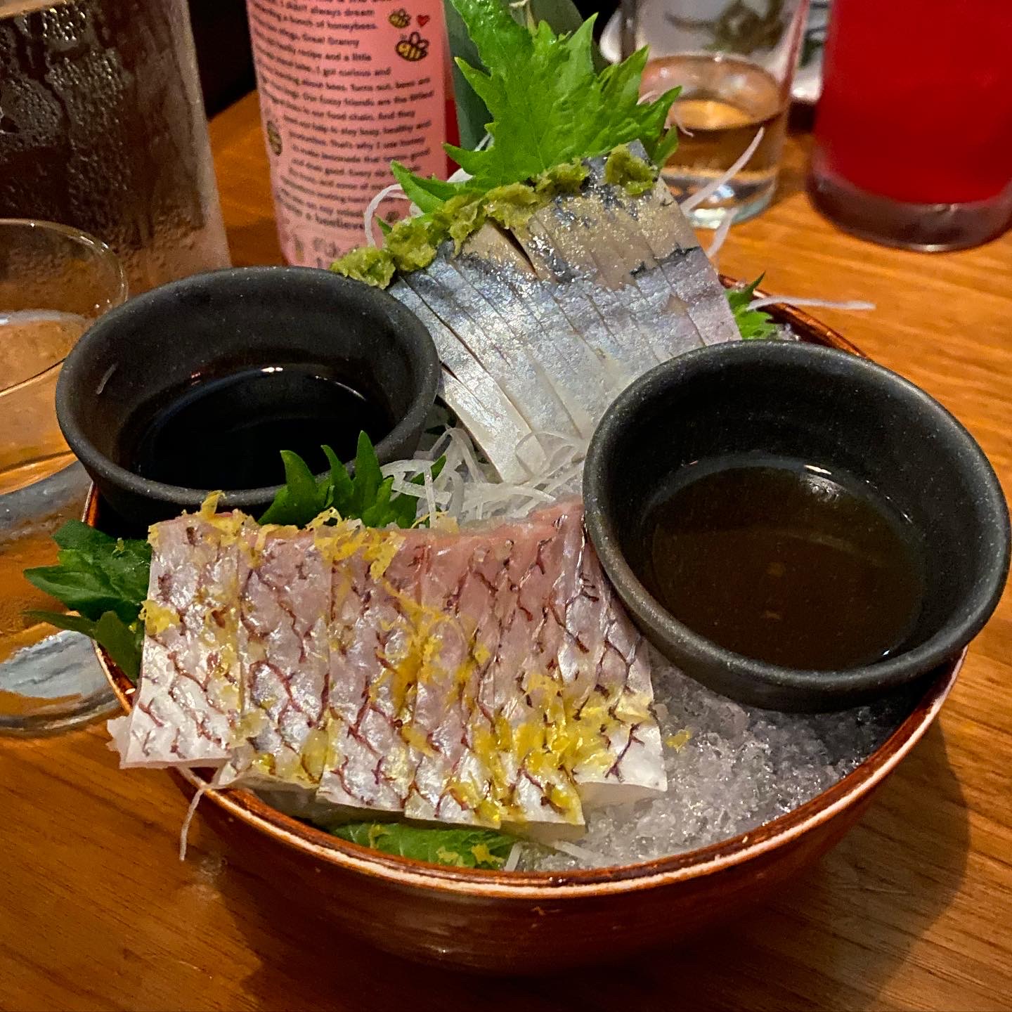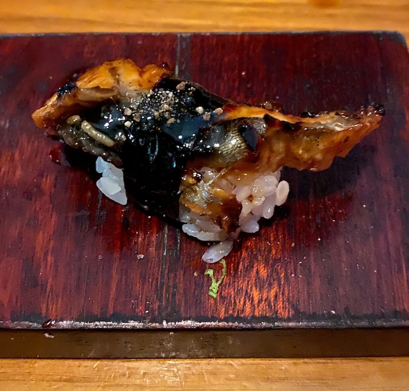 Our next plate were two types of sashimi: madai (japanese sea bream) and shime saba (Norwegian mackerel). The dish was decorated beautifully, the colors of the fish contrasting blue and red, thin and thick. The sashimi sat on a bowl of ice, dressed with edible leafy greens, grated daikon, and two sauces. The madai had a dash of lemon zest. The shime saba was dressed in the nude, its shiny skin the star of the show. Both of these pieces of sashimi were excellent. The shime saba was like butter, melting in your mouth. The madai was more thick, rich in flavor, while also melting in your mouth. We wanted more, but the portion was perfect to allow us to fully appreciate the flavors and creatures. 11/10 for both.