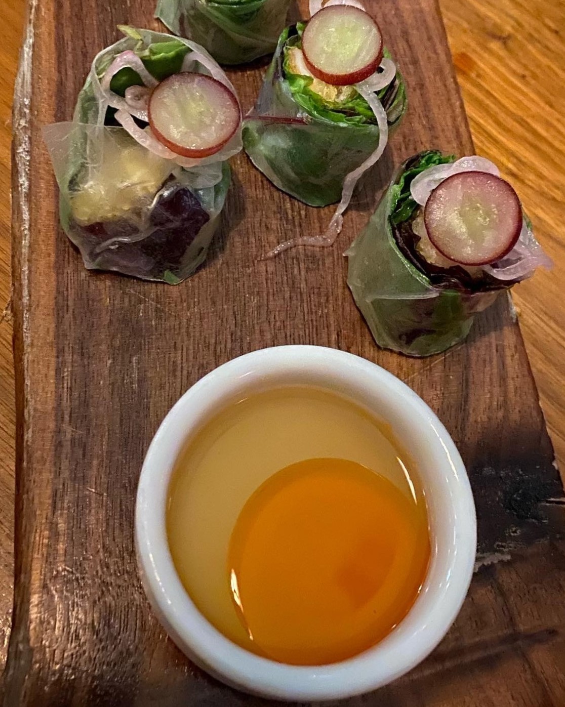 Our next dish was the biendo, off the makimono section. The biendo is a tempura shrimp spring roll with nuoc mam, leafy greens and topped with a grape. It was served with an orange rice vinegar that gave the roll more depth flavor-wise. There were an even number of rolls, so we got to happily share 50/50. The roll was exquisite and the combination between the fried shrimp and the cool grapes proved to be an excellent choice. 10/10.