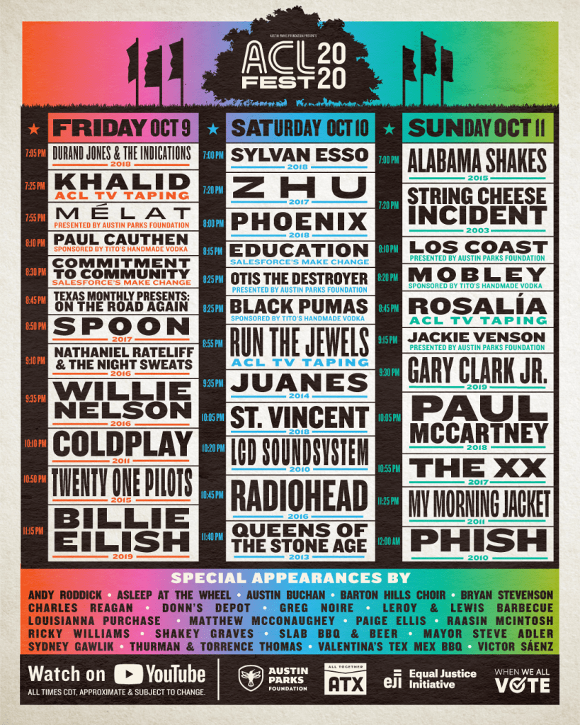 This year, ACL Fest 2020 will be supporting All Together ATX, the Equal Justice Initiative, and When We All Vote. You can stream the festival on Youtube. Note that all times are Central time. For more information, you can check out their website here.